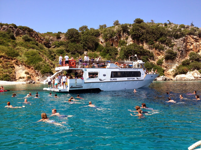 Derweil ist's Mittag. Auf Jovy werden Vorbereitungen fürs Mittagsmenü getroffen. Und während ein Kellner in weißem Hemd und schwarzer Fliege dem Operndirektor die Menüvorschläge nebst Weinkarte erläutert, läuft zu meiner Linken ein Boot mit der großen Aufschrift GLAS BOTTOM ein. Voll mit Studenten, Pärchen, Familien mit Kindern. Ein buntes Völkchen betritt die Bühne von links, das wie auf Kommando von allen Seiten ins Wasser hüpft. Ein Heidenspaß, und ein bisschen Discomusik ist auch dabei. In die leere Bucht ist das Leben zurückgekehrt.